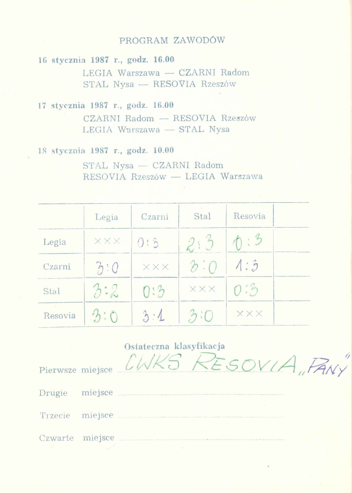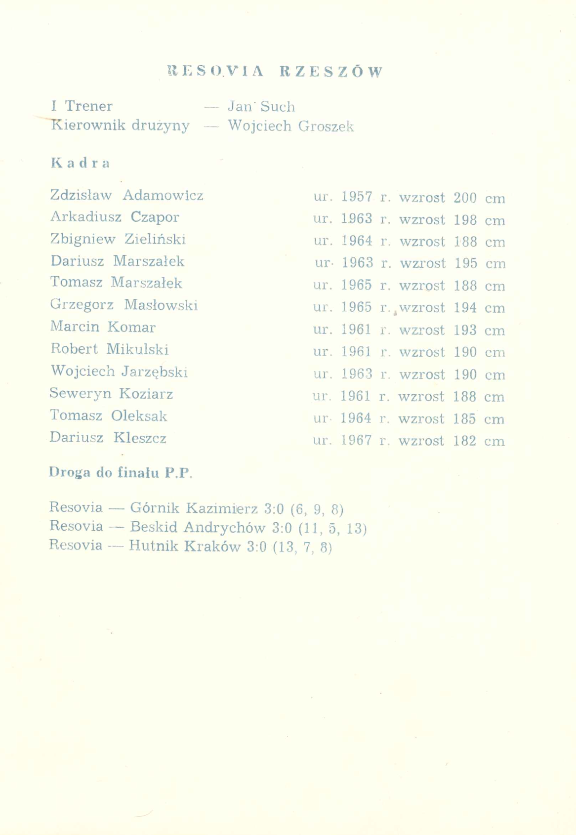 Skład Resovii, zdobywcy Pucharu Polski w 1987 w Lesznie: Robert Mikulski, Zbigniew Zieliński, Wojciech Jarzębski, Mariusz Komar, Zdzisław Adamowicz, Arkadiusz Czapor, Dariusz Marszałek, Tomasz Marszałek, Grzegorz Masłowski (wybrany najlepszym zawodnikiem turnieju), Seweryn Koziarz. Trener: Jan Such.