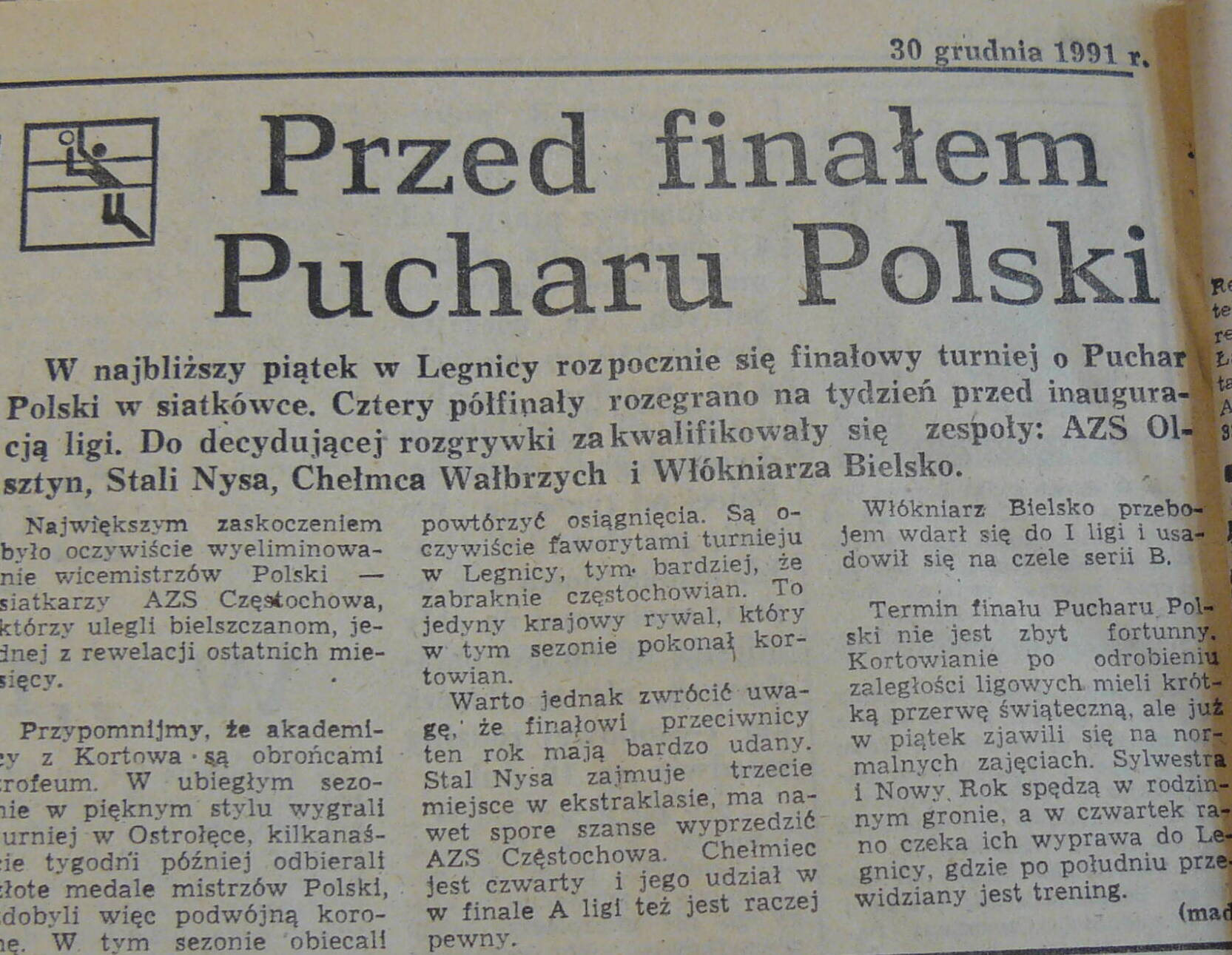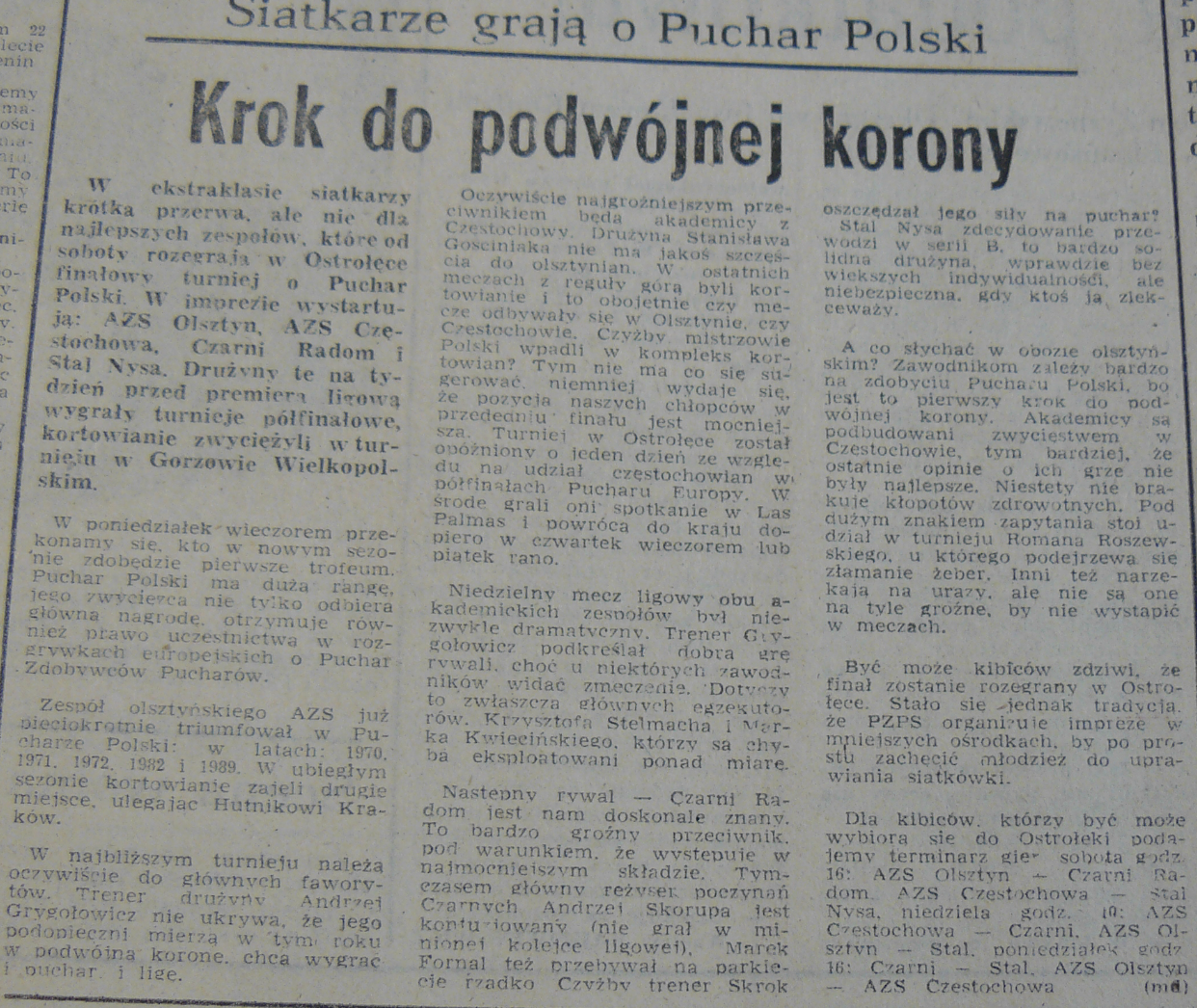 Indykpol AZS Olsztyn po 17 latach ponownie znalazł się w najlepszej czwórce TAURON Pucharu Polski. Kibice z Warmii na trzynaste trofeum w historii klubu czekają dwa razy dłużej, bo od 1992 roku, kiedy Akademicy z Kortowa obronili podwójną koronę, najpierw zdobywając puchar w Legnicy, a następnie wygrywając w finale ligi z AZS-em Częstochowa. Zimowe podróże na południe Polski potrafiły wtedy trwać dobę, a olsztyńscy kibice dzięki znajomościom na kolei na decydujące mecze pod Jasną Górę wybrali się... wagonem sypialnym i nocowali w nim na bocznicy.