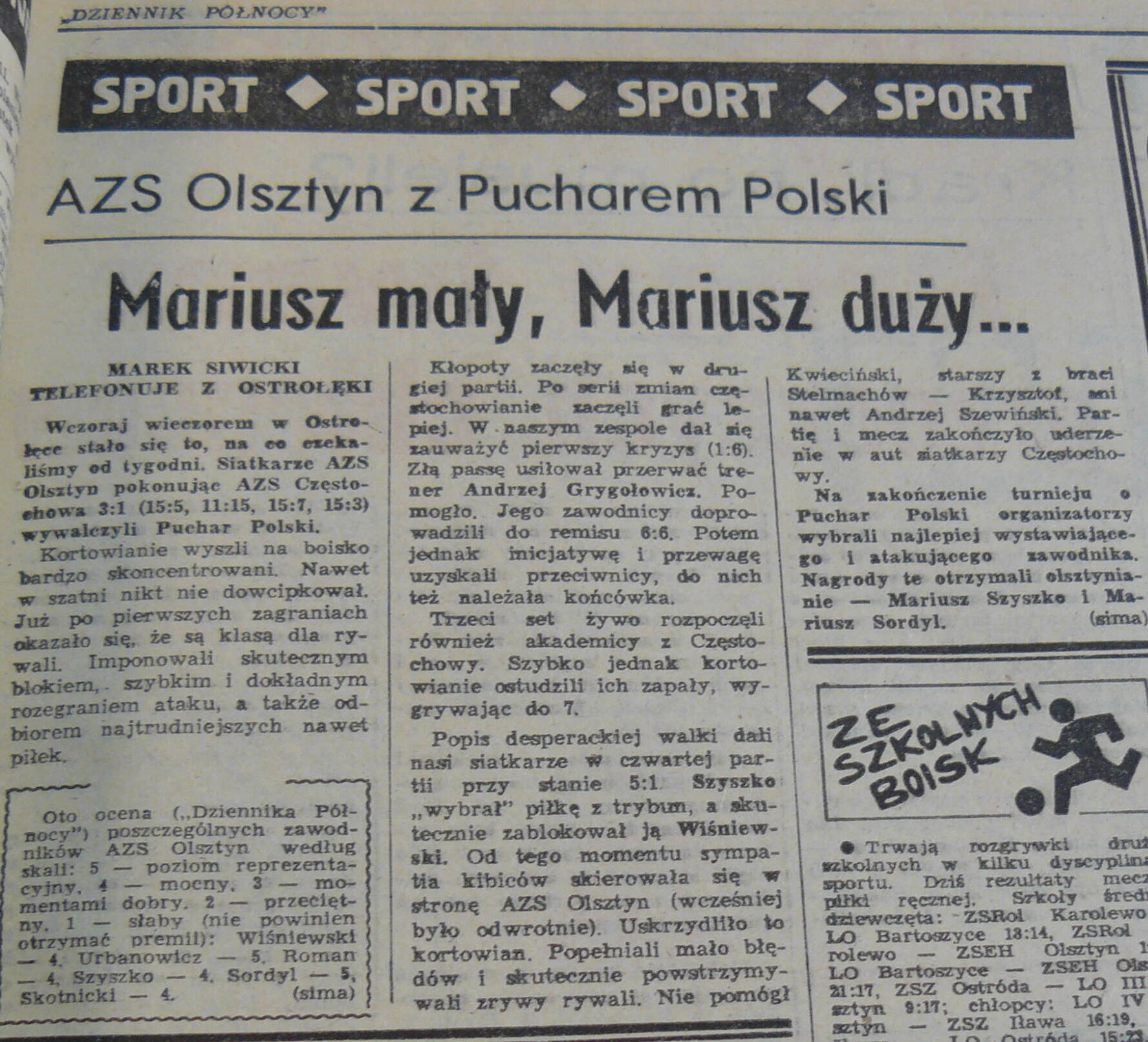 Dopiero po jakiejś godzinie czy nawet dłużej się to wszystko wyjaśniło - dopowiada Jerzy Mróz, wtedy szef Klubu Kibica AZS-u, a dziś prezes Warmińsko-Mazurskiego ZPS i organizator Memoriału Huberta Jerzego Wagnera. - Ludzie nerwowi wychodzili palić papierosy, bo wtedy było to modne. Pozostali czekali w hali, bo na zewnątrz było zimno. Aż w końcu ktoś przy stoliku krzyknął: "ludzie, ludzie, jednak AZS Olsztyn z pucharem" i to poszło lawinowo. Komunikat spikera nie miał już znaczenia.
