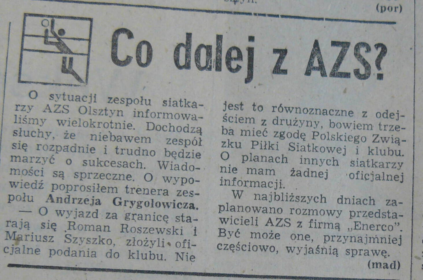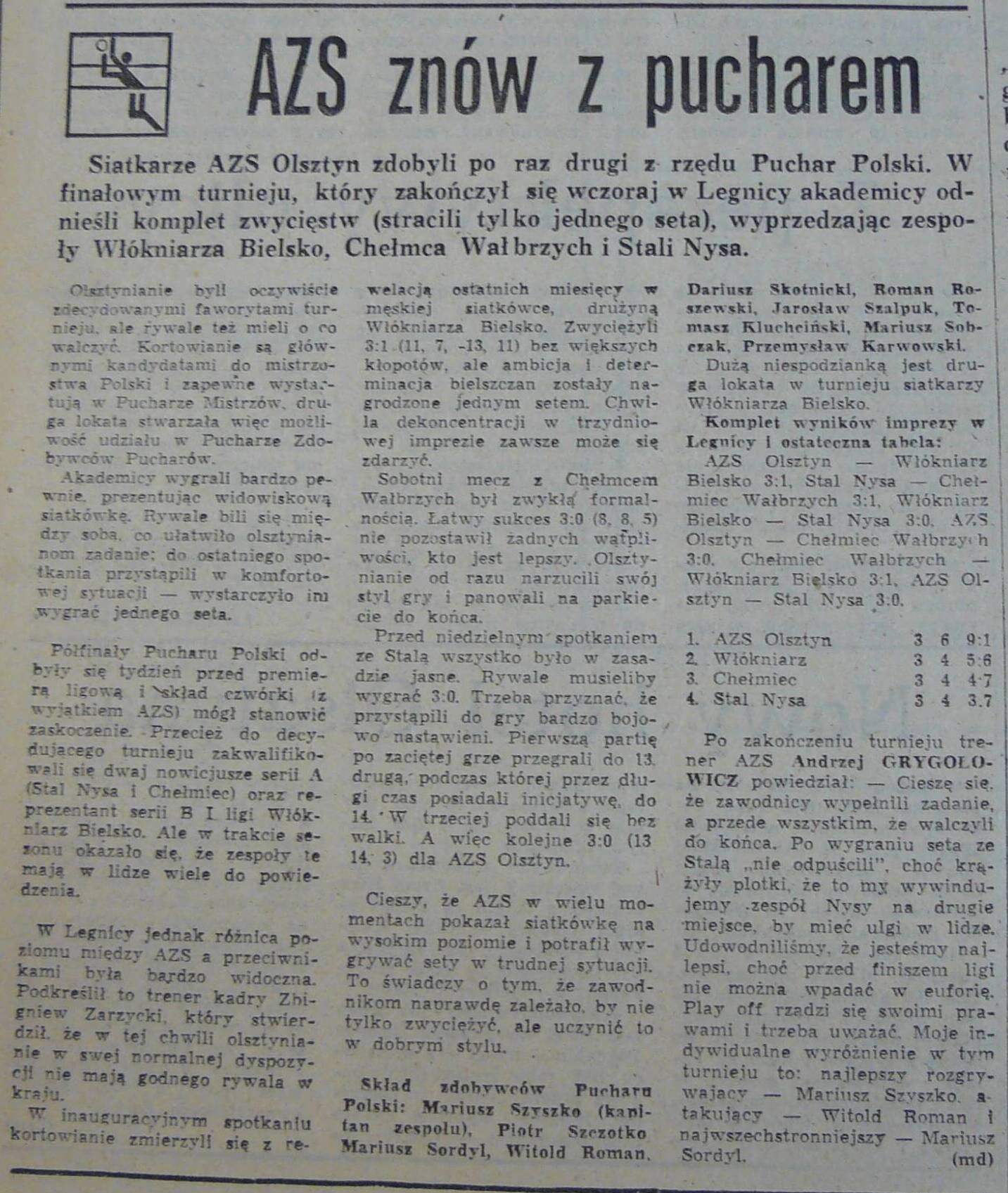 Artykuł powstał w oparciu o materiały zgromadzone przez Karolinę Grzegorzewską i Martę Panasiuk, zawierające archiwalne wycinki z Gazety Olsztyńskiej, Dziennika Północy i Dziennika Pojezierza oraz książki Krzysztofa Mecnera "80 lat polskiej siatkówki - Od "przebijanki" do ligi światowej", a także serię artykułów "Z kart historii AZS Olsztyn" na oficjalnej stronie Indykpolu AZS-u Olsztyn.